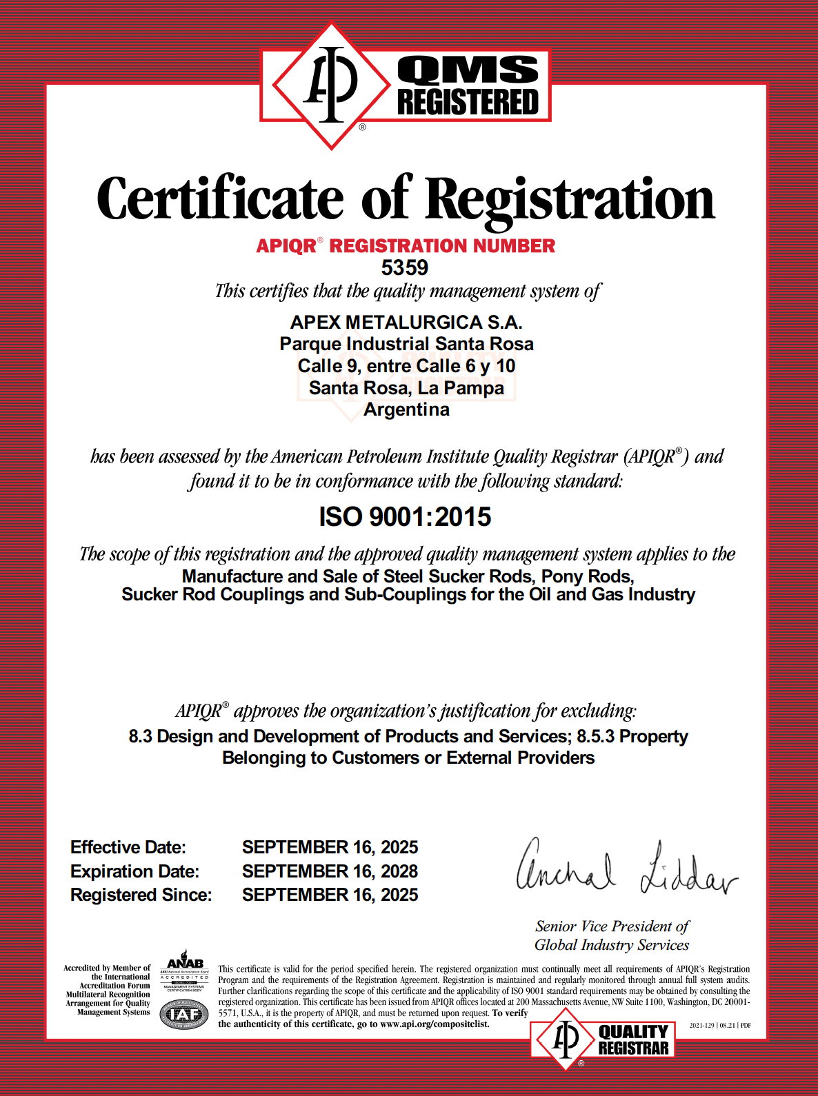 APEX establece la Calidad de sus productos como base de su estrategia y valor fundamental de la cultura de la empresa